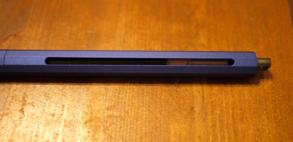ペン本体(軸)の側面に2か所、スリット(縦長の窓)があります。ここから内側にセットしているリフィルのインクがどれくらい残っているか一目でわかります