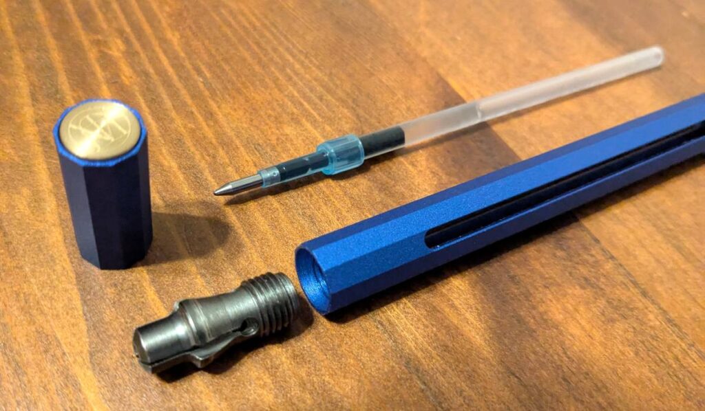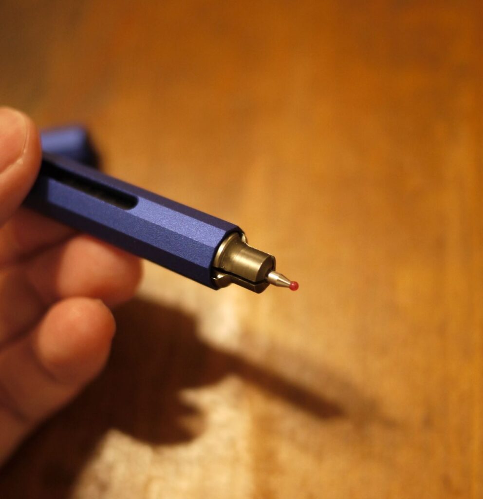• するとインクのリフィルの先端を、ペン本体がガチンと挟んでホールドします。