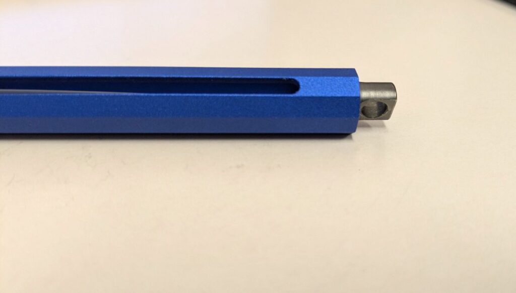 金属製の軸の表面は、比較的細かなザラザラです。よっぽど手が乾燥していれば別かもしれませんが、指でペンを保持して滑る感覚はありません
